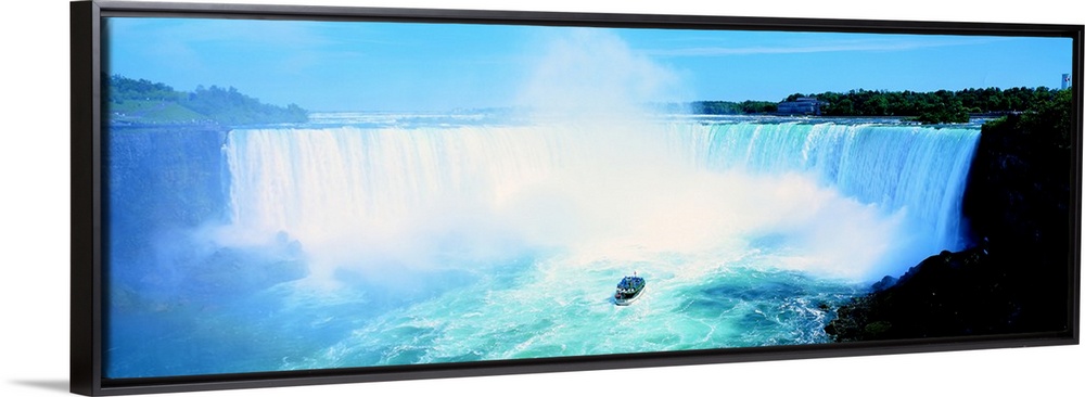 <p>Long wall art of Niagara Falls rushing downward and a boat of tourists approaching it from the bottom.</p>