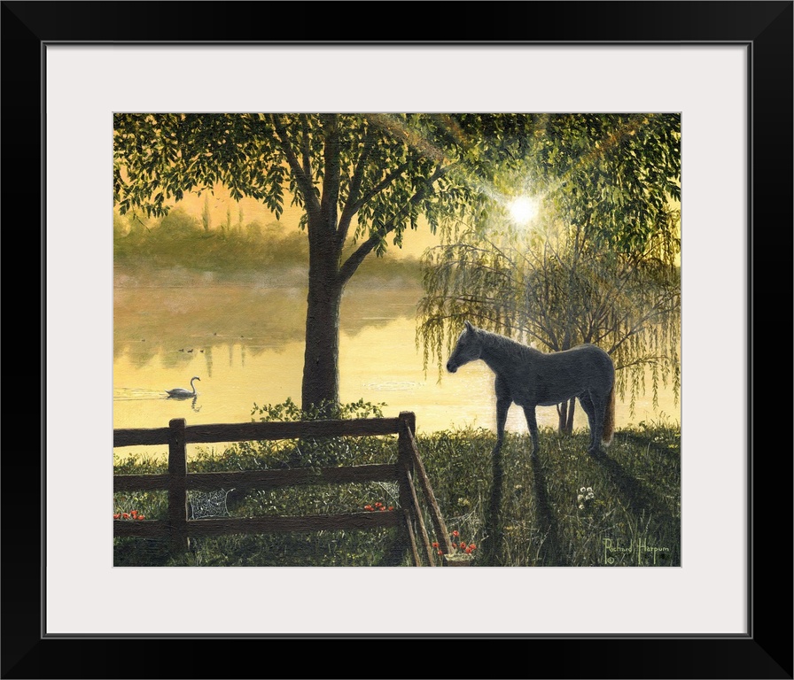 <p>Contemporary artwork of a horse looking at a swan slowly passing by in the water in the early morning light.</p>