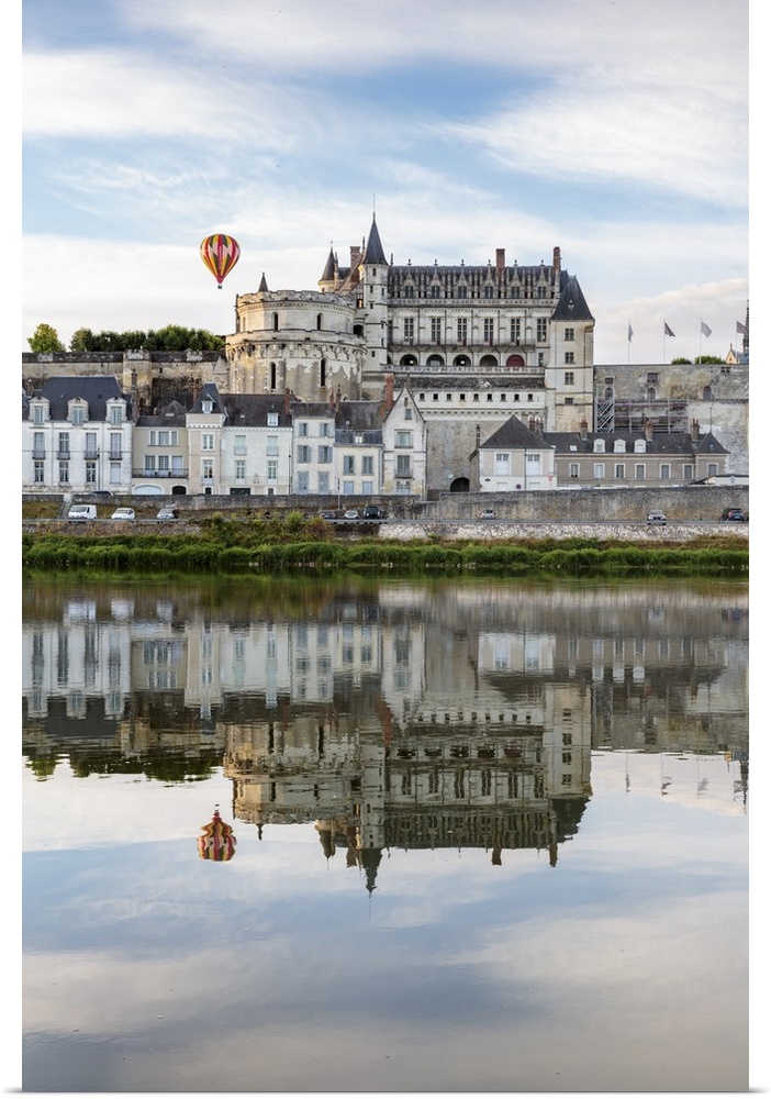<p>Hot-air balloon in the sky above the castle, Amboise, Indre-et-Loire, Loire Valley, France</p>
