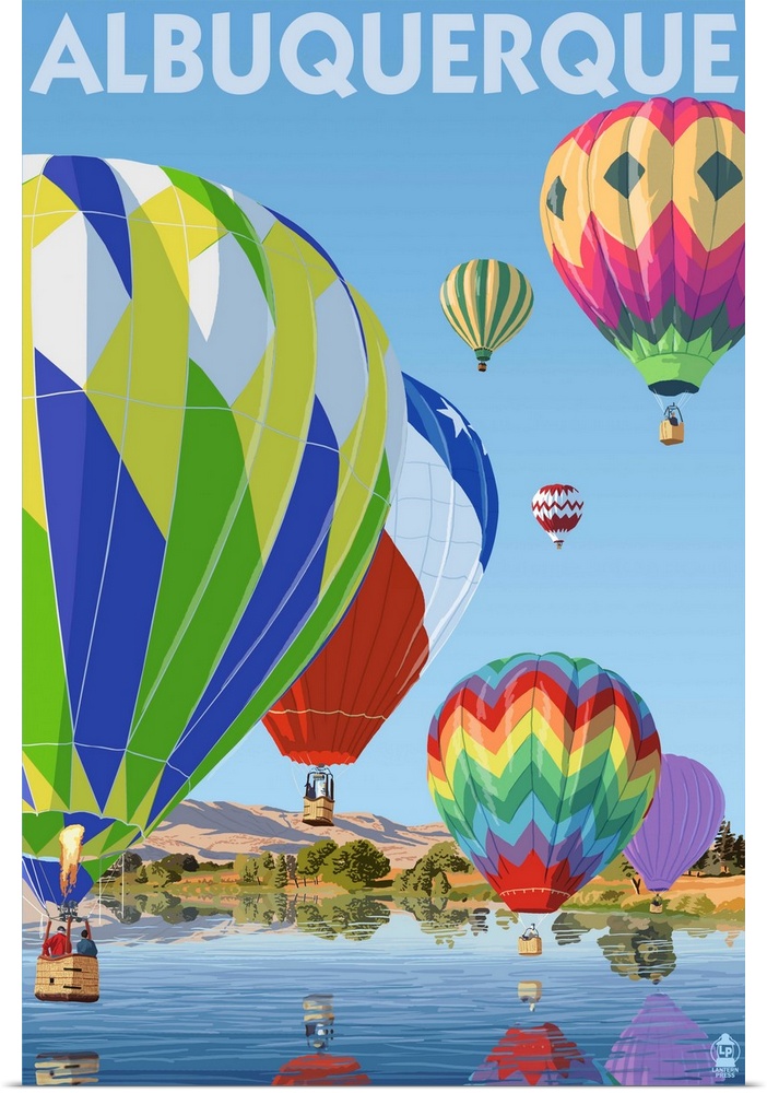 <p>Retro stylized art poster of hot air balloons flying over a lake casting reflections.</p>