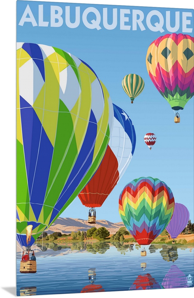 <p>Retro stylized art poster of hot air balloons flying over a lake casting reflections.</p>