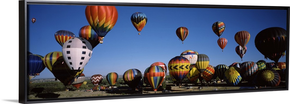 <p>Panoramic photo of dozens of colorful hot air balloons taking flight at the International Balloon Fiesta in Albuquerque, New Mexico.</p>