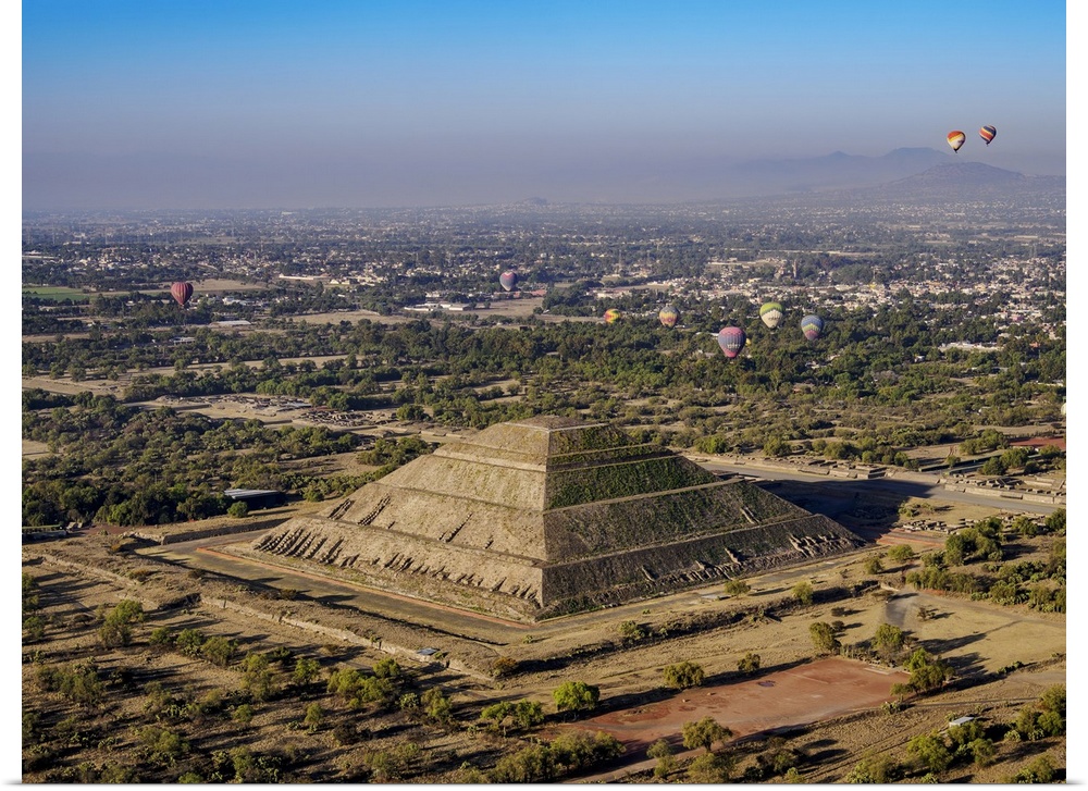 <p>Hot air balloons flying over the Pyramid of the Sun and Avenue of the Dead at sunrise, aerial view, Teotihuacan, Mexico State, Mexico</p>