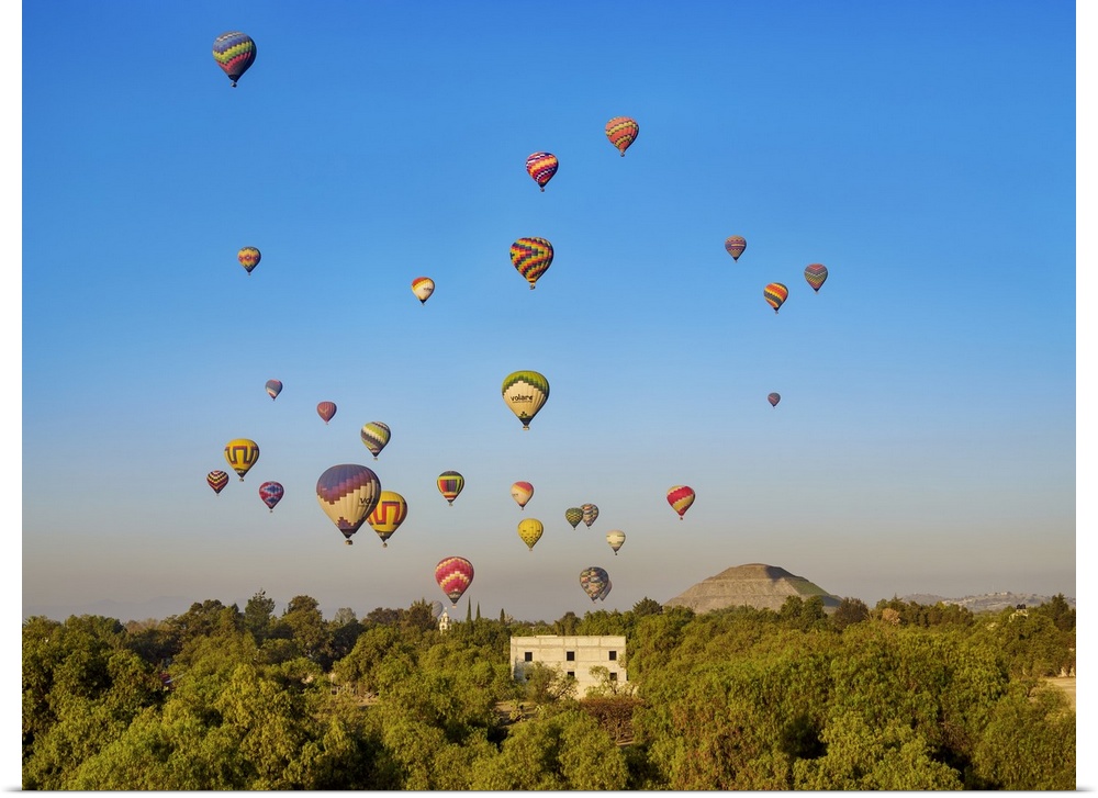 <p>Hot air balloons flying over the Pyramid of the Sun at sunrise, aerial view, Teotihuacan, Mexico State, Mexico</p>