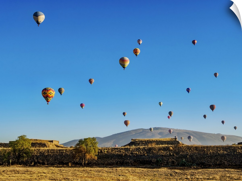 <p>Hot air balloons flying over the Teotihuacan Archaeological Site at sunrise, Mexico State, Mexico</p>
