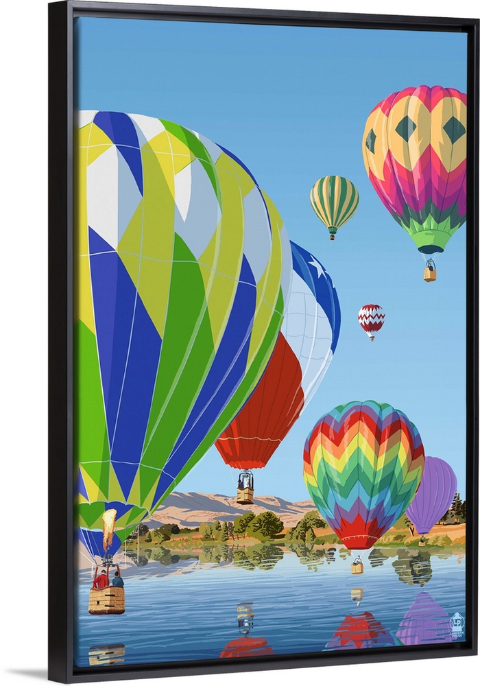 <p>Retro stylized art poster of a fleet of hot air balloons over water.</p>