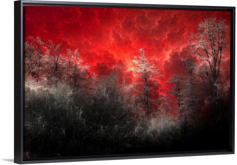 <p>Horizontal, large wall art of a black and grey forest of trees beneath a deep red sky with billowing clouds.</p>