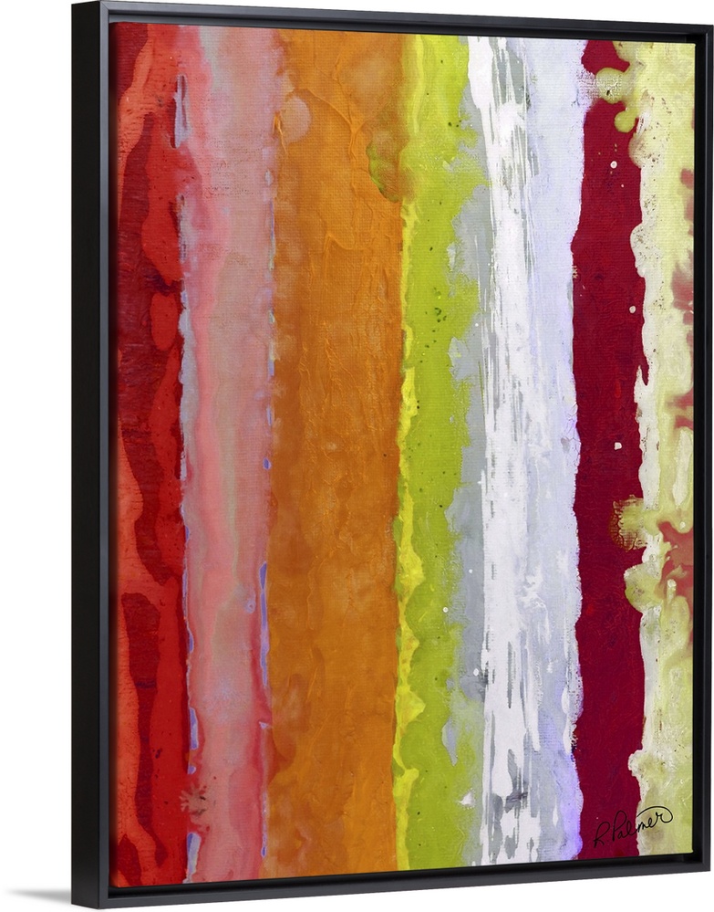 <p>Colorful abstract painting with vertical bands of color in shades of red, pink, orange, yellow, green, purple, and white.</p>