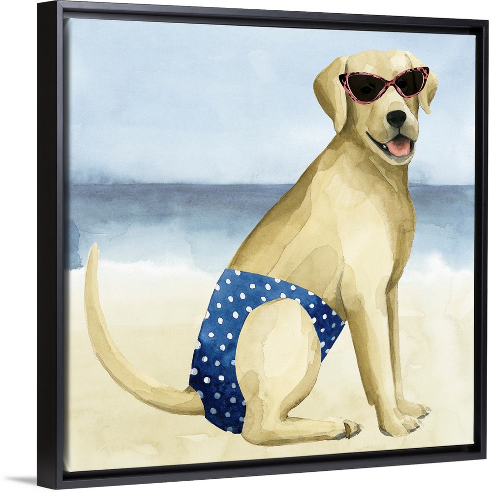 <p>Square watercolor painting of a Labrador wearing a bathing suit and sunglasses on a beach.</p>