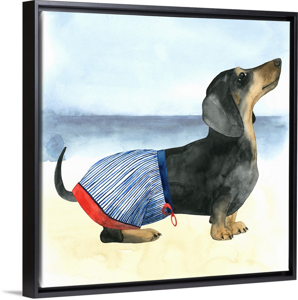 <p>Square watercolor painting of a Dachshund wearing a bathing suit on the beach.</p>
