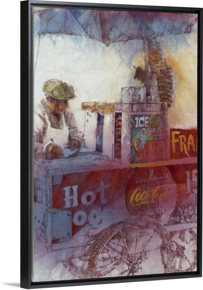 <p>A contemporary painting of a man standing at a hot dog vendor.</p>