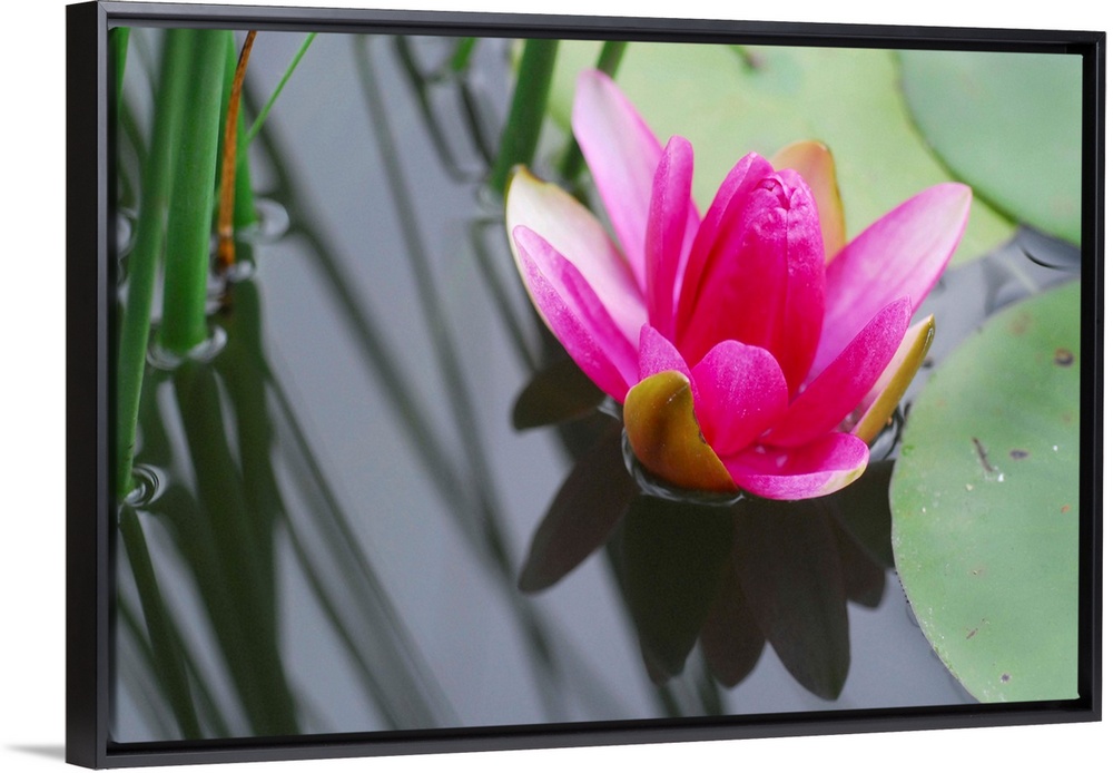 <p>A lovely vivid hot pink lotus or water lily in a pond with shadows and greens.</p>