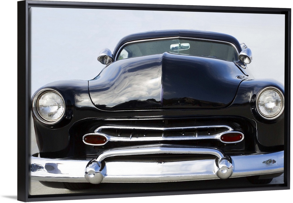 <p>The front of a classic car with a chrome bumper and dark paint.</p>