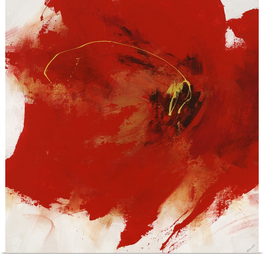 <p>Abstract painting of a large red flower with edges that are spattered and roughly brushed on a solid white background.</p>