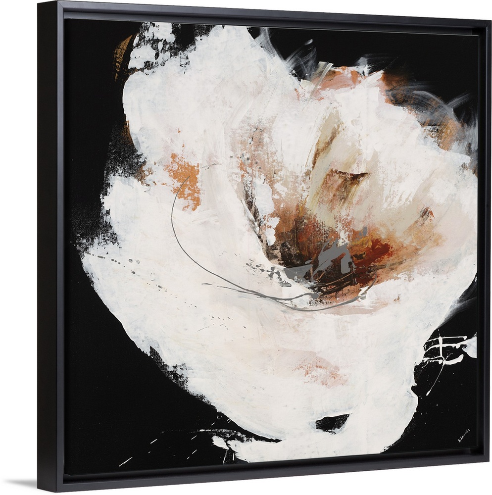 <p>Abstract painting of a large white flower with a dark center, painted with thick brushstrokes and spattered edges on a solid black background.</p>