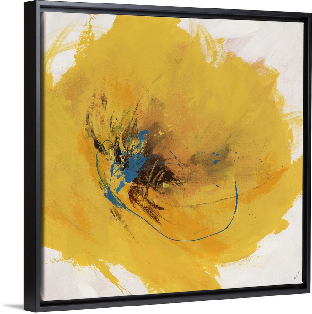 <p>Abstract painting of a large golden flower with a dark center, painted with thick sweeping brushstrokes and spatters, on a light neutral background.</p>