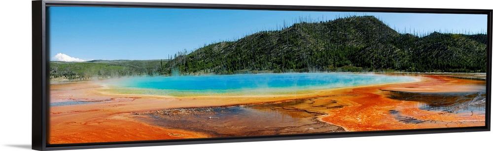 <p>Hot springs at Yellowstone National Park. Panorama of the Grand Prismatic Spring in Midway Geyser Basin, Yellowstone National Park, Wyoming. This is the largest hot spring in the U.S. and third largest in the world. The red areas are bacterial mats, caused by bacteria growing in the hot spring water.</p>