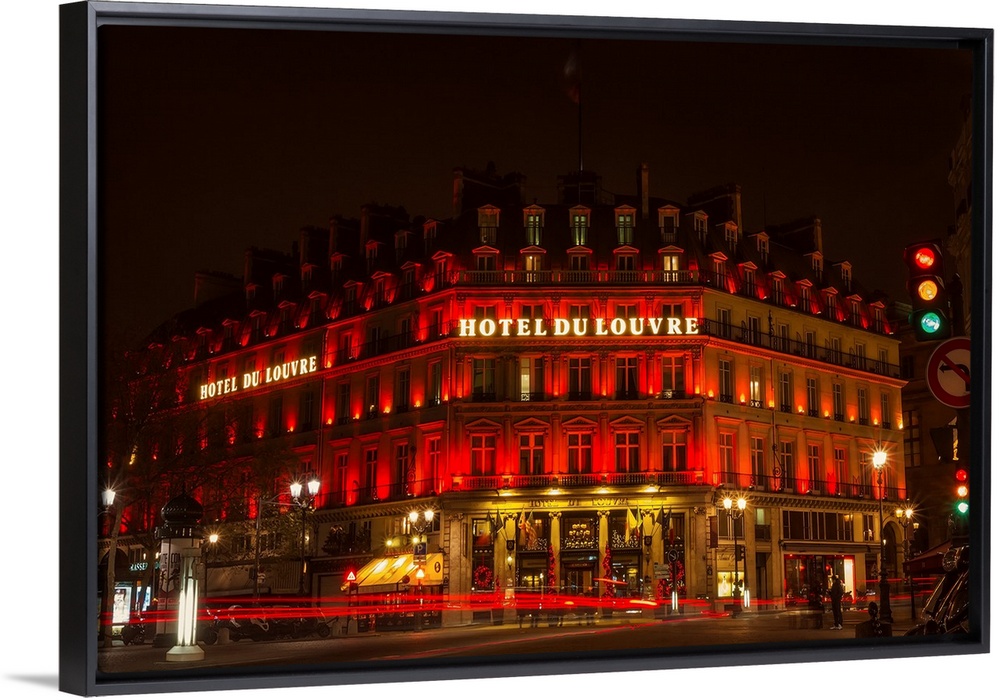 <p>A photograph of the Hotel du Louvre at night.</p>