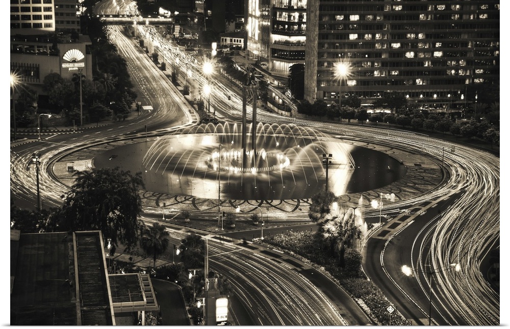 <p>Hotel Indonesia Roundabout and fountains, new design of pool, and lighting at night in Jakarta, Indonesia.</p>