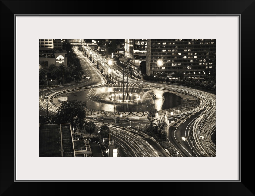 <p>Hotel Indonesia Roundabout and fountains, new design of pool, and lighting at night in Jakarta, Indonesia.</p>