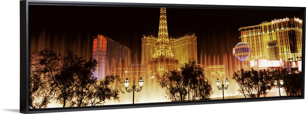 <p>Panoramic photograph of ""Sin City"" skyline and Bellagio fountains with tree and street lamp silhouettes in the foreground.</p>