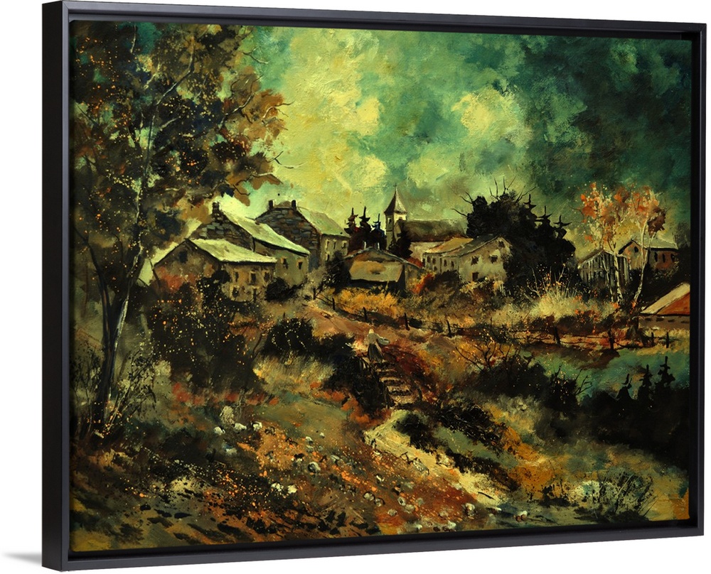 <p>Painting of the village of Houdremont, Belgium in dark shades of earth tones.</p>
