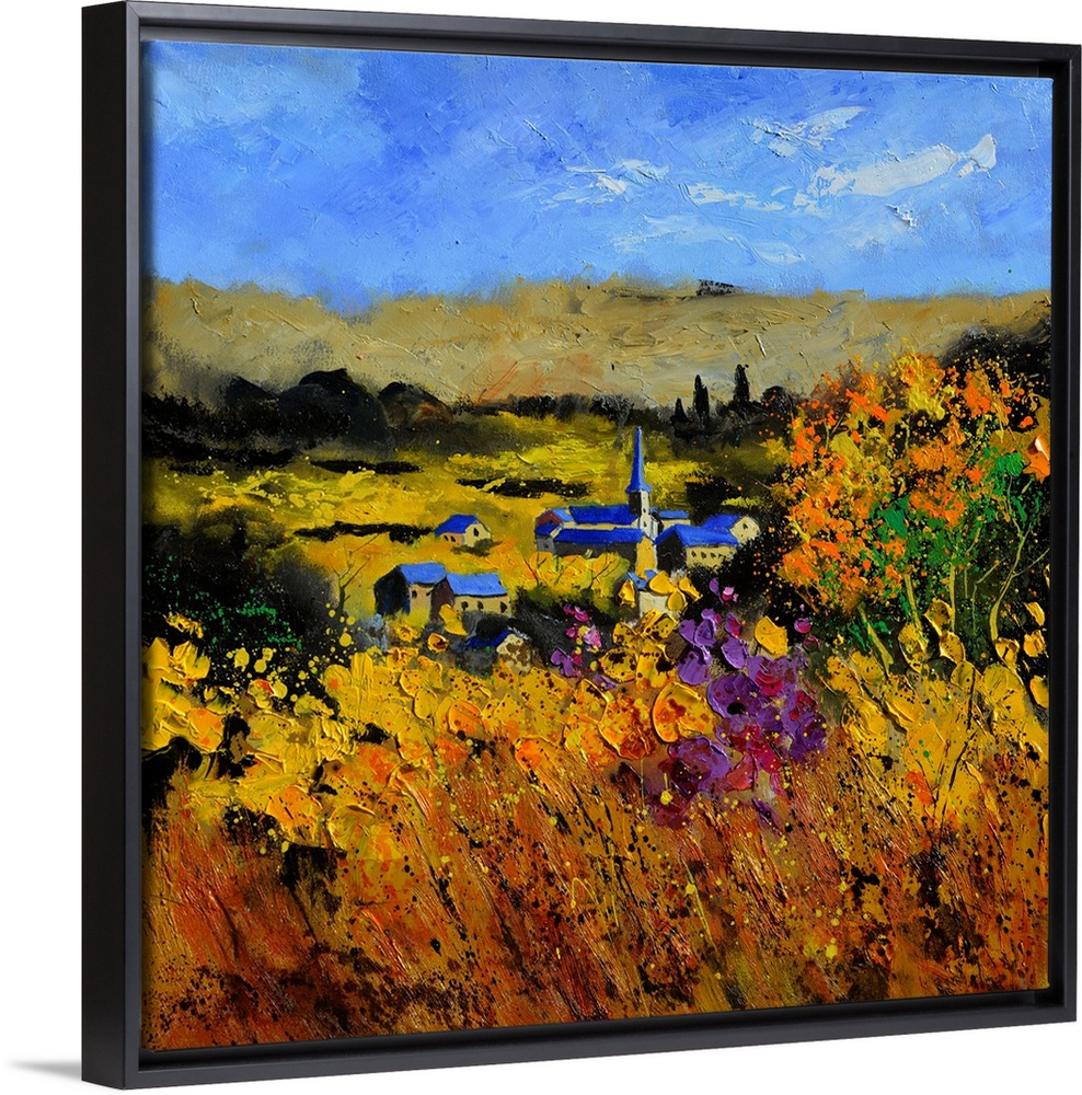 <p>Square painting of a field with flowers in the foreground and a Belgium village in the background with cloudy sky in the distance.</p>