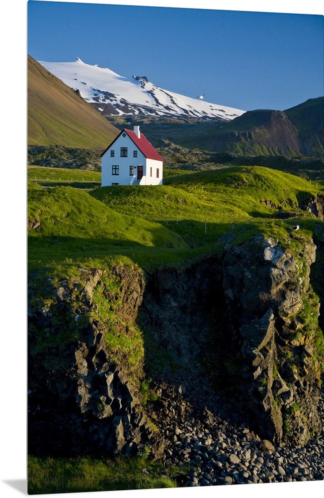 <p>House near basaltic columns with Snaefellsjokull Volcano in the background.</p>