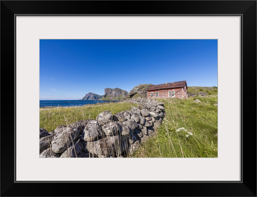 <p>House of fishermen called rorbu surrounded by sea, Sorland, Vaeroy Island, Nordland county, Lofoten archipelago, Norway, Scandinavia, Europe</p>
