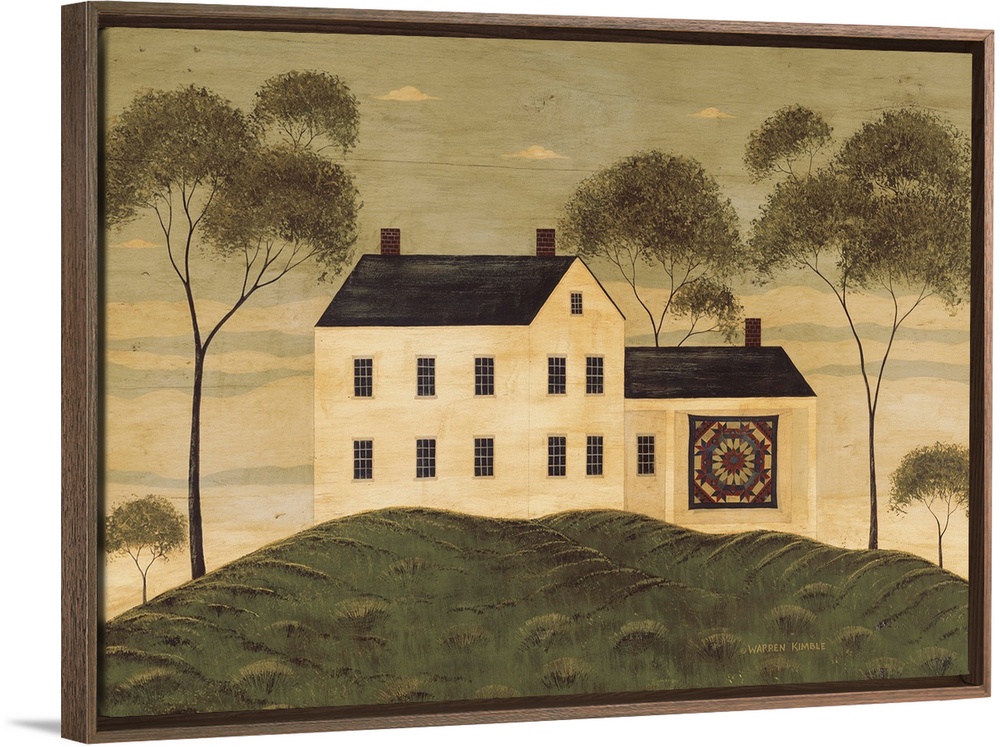 <p>Large, landscape folk art in vintage tones of a large house on a hill, with a handmade quilt hanging on the side of it. The house is surrounded by tall, thin trees.</p>