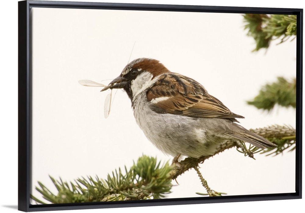 <p>George Reifel Migratory Bird Sanctuary, British Columbia, Canada. House sparrow sitting on a branch eating an insect.</p>