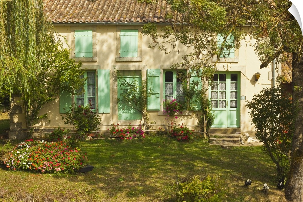<p>House with typical regional green shutters in the Marais Poitevin wetlands, Arcais, Nouvelle-Aquitaine, France</p>