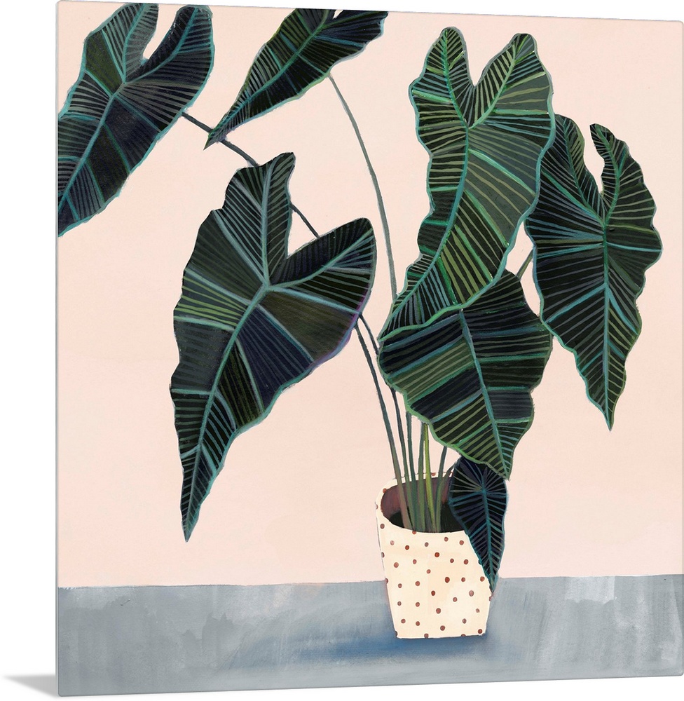 <p>Modern painting of a leafy houseplant in a cream colored pot with spots on a muted blue and cream backdrop.</p>