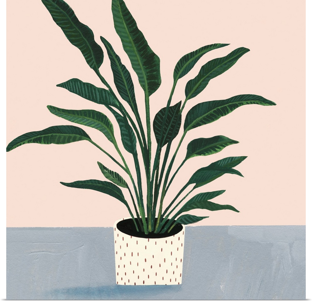 <p>Modern painting of a leafy houseplant in a cream colored pot with spots on a muted blue and cream backdrop.</p>