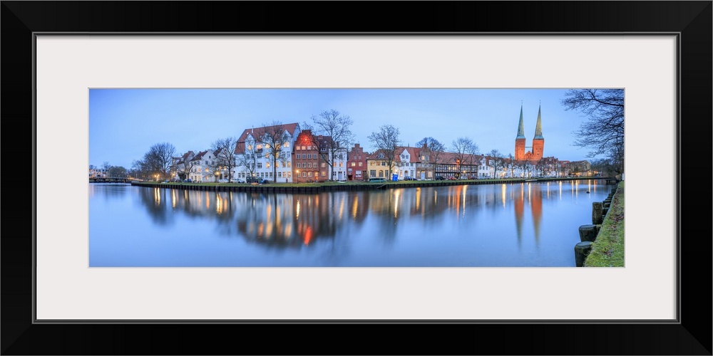 <p>Panorama of typical houses and towers of the cathedral reflected in river Trave at dusk, Lubeck, Schleswig, Holstein, Germany.</p>