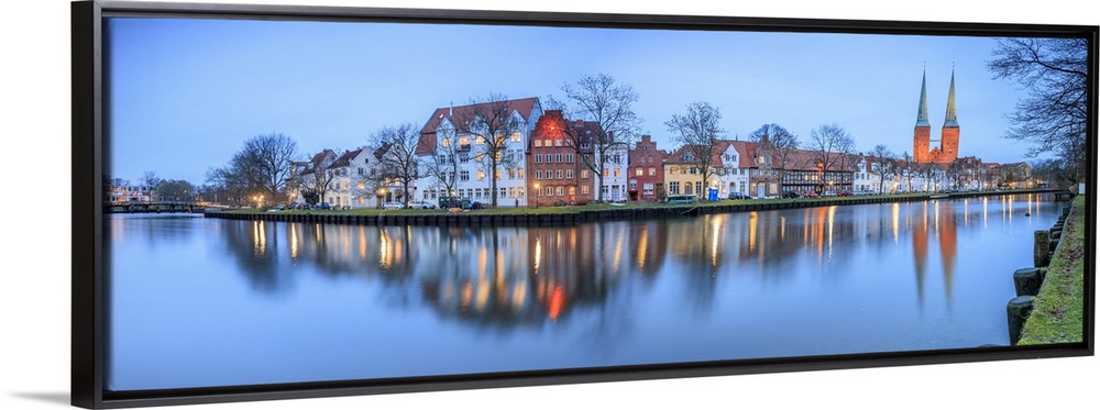 <p>Panorama of typical houses and towers of the cathedral reflected in river Trave at dusk, Lubeck, Schleswig, Holstein, Germany.</p>