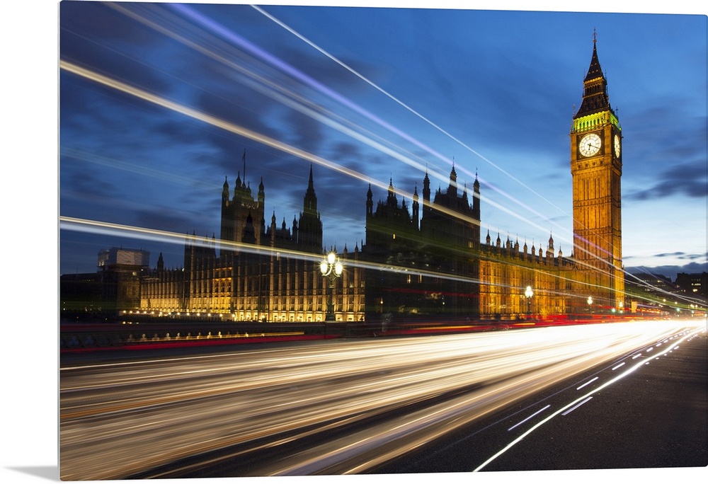 <p>Houses of Parliament and Big Ben floodlit at night with colourful light trails from passing traffic on Westminster Bridge, London, England, United Kingdom, Europe</p>