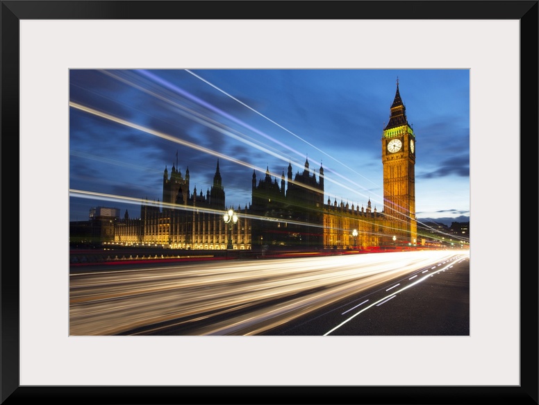 <p>Houses of Parliament and Big Ben floodlit at night with colourful light trails from passing traffic on Westminster Bridge, London, England, United Kingdom, Europe</p>