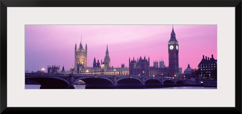 <p>London Skyline in the evening. Thames river in foreground with Big Ben, Halls of Parliament. The pale overcast sky reflects the pink twilight glow.</p>