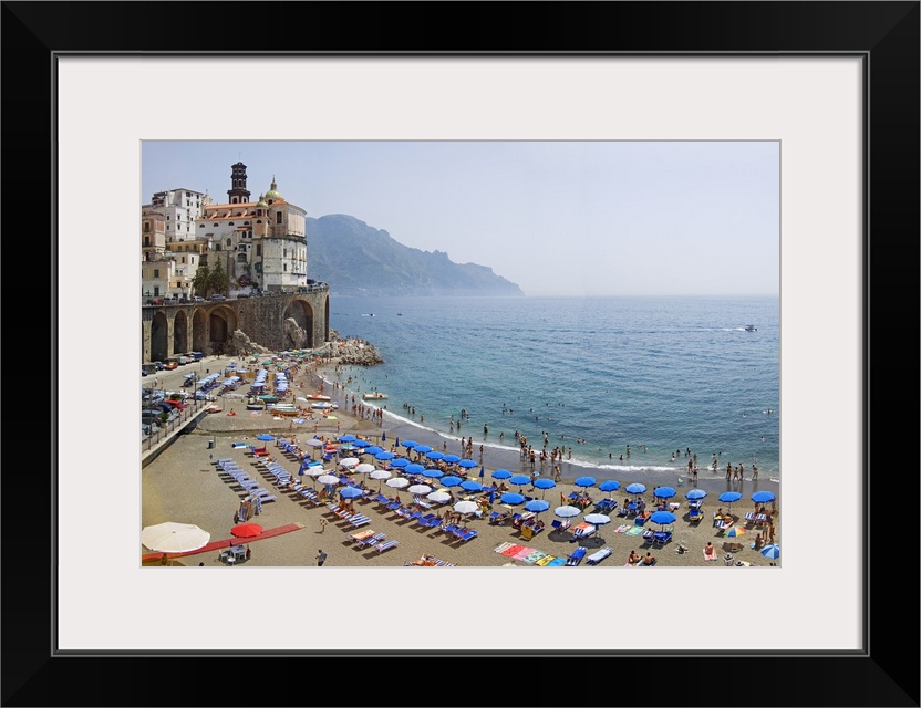 <p>Summer scene on the beach with lots of parasols and swimmers, and historic buildings on the edge of the ocean.</p>