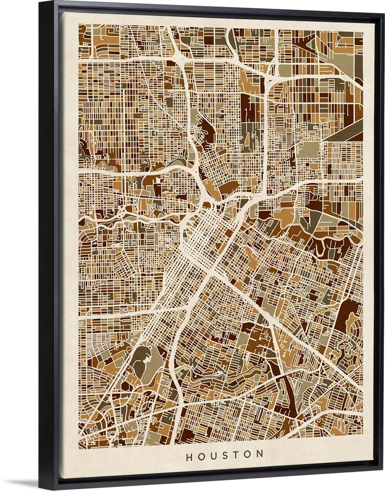 <p>Brown toned city street map artwork of Houston.</p>