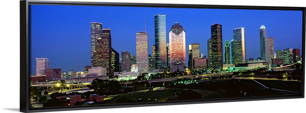 <p>Decorative artwork for the home or office this photograph captures the city skyline and surrounded road ways on a panoramic shaped wall art.</p>