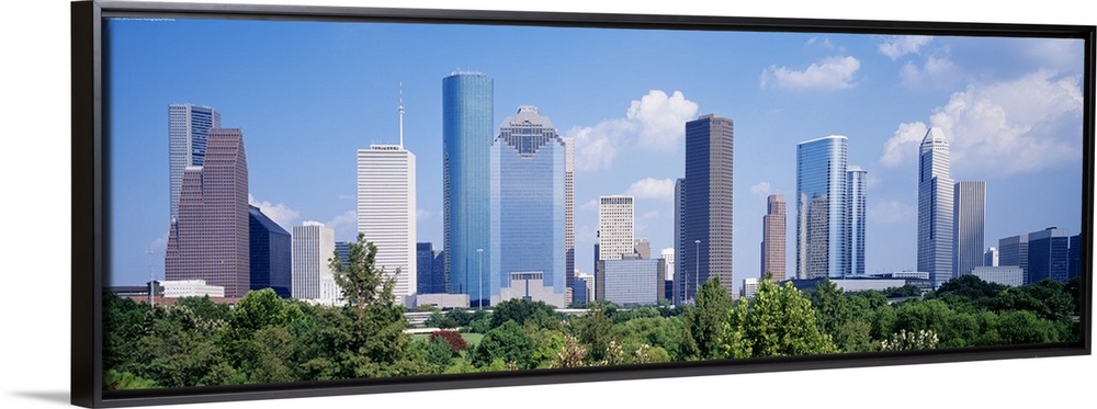 <p>Panoramic photo of the Houston cityscape against a blue sky.</p>