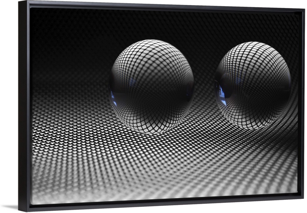 <p>Two glass spheres reflecting a field of small dots.</p>
