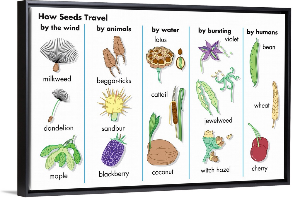 <p>An educational poster from Encyclopaedia Britannica showing the various ways seeds are spread.</p>
