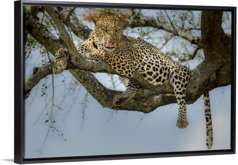 <p>Photograph of a leopard laying in a tree licking its lips.</p>