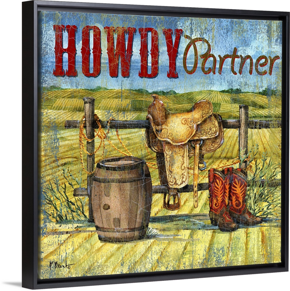 <p>An assortment of cowboy-themed items including a saddle, barrel, and boots.</p>