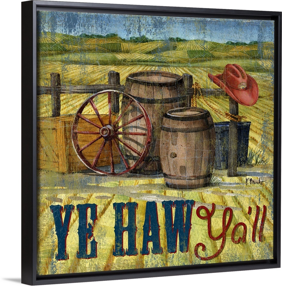 <p>An assortment of cowboy-themed items including a wagonwheel, barrel, and hat.</p>