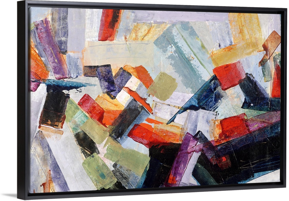 <p>Large abstract painting with thick, angled, brushstrokes of color moving in all directions and layered on top of each other.</p>