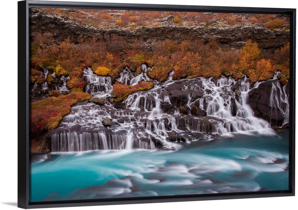 <p>Waterfalls leading into turquoise water in Iceland.</p>